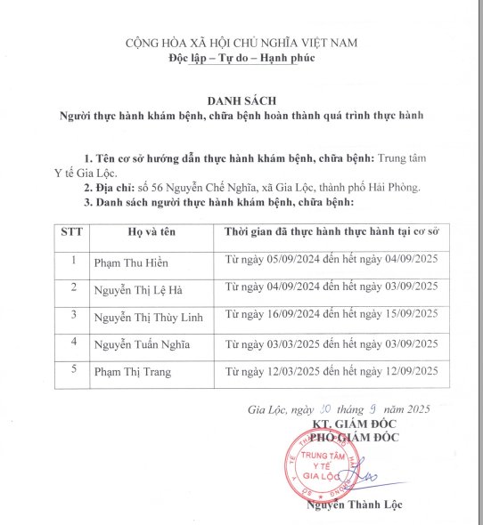 Danh sách hoàn thành QT thực hành KB, CB tháng 9/2025