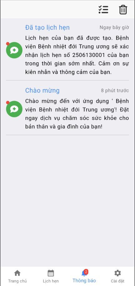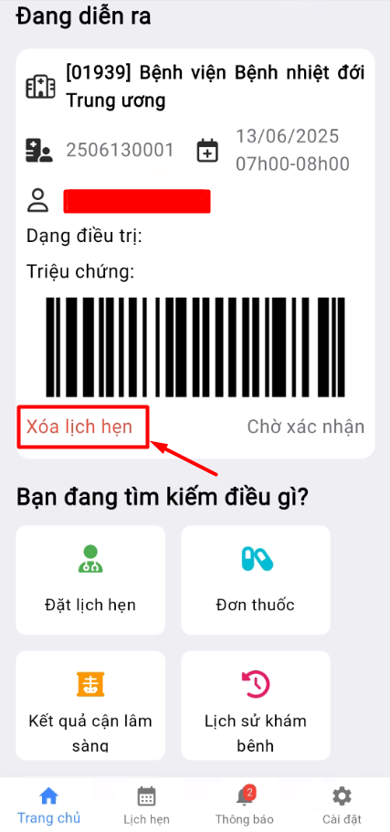 Chức năng này cho phép người dùng xóa lịch hẹn khám bệnh