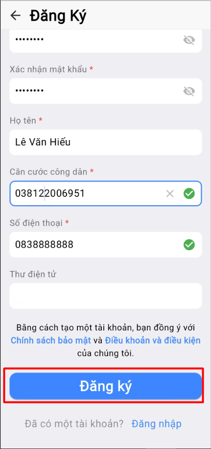B2: Nhập đủ thông tin xong nhấn “Đăng ký” để đăng ký là thành công
