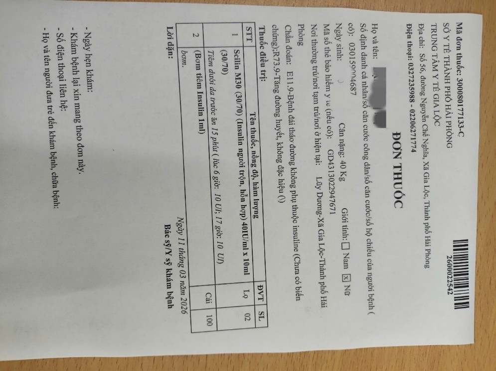 Một đơn thuốc bác sĩ kê liều tiêm insulin 2 lần, tiêm sáng 10 UI, chiều 10UI