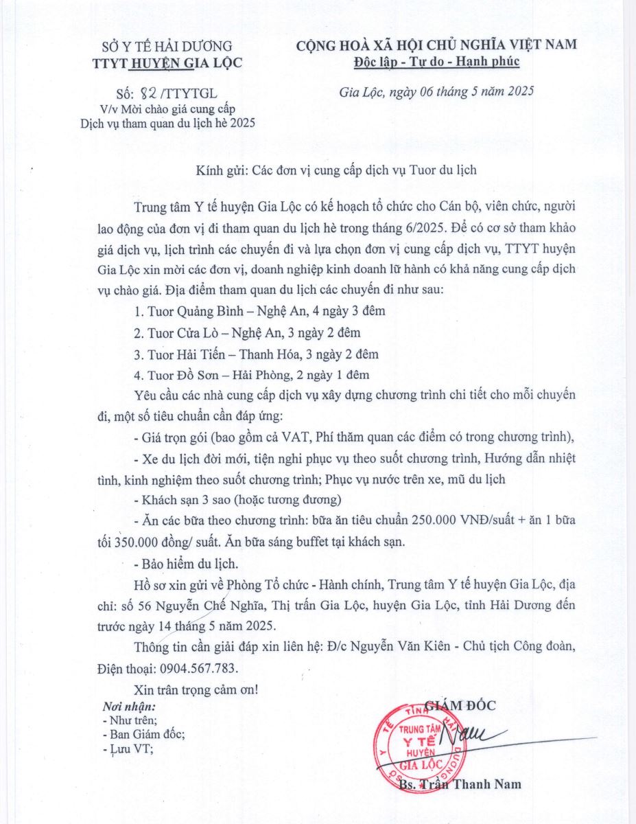 Mời chào giá cung cấp dịch vụ tham quan du lịch hè 2025